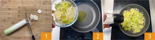 Pour préparer l'omelette aux poireaux, commencez par ces derniers. Épluchez-les en enlevant les feuilles extérieures, la partie verte et les éventuelles racines ; puis coupez-les en rondelles d'environ 2 mm 1. Dans une poêle de 28 cm de diamètre, faites chauffer un filet d'huile, puis ajoutez les poireaux 2 et assaisonnez avec du sel 3.