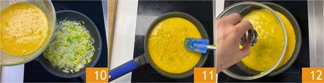 Versez le mélange dans la poêle avec les poireaux bien chaude 10, puis répartissez les œufs uniformément avec une spatule 11 et couvrez avec un couvercle 12.