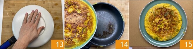 Faites cuire à feu moyen pendant 15 minutes, puis retournez l'omelette à l'aide d'une assiette 13 et remettez-la dans la poêle 14. Faites cuire de l'autre côté pendant 7 minutes en baissant légèrement le feu. Transférez l'omelette aux poireaux dans un plat de service et servez 15 !