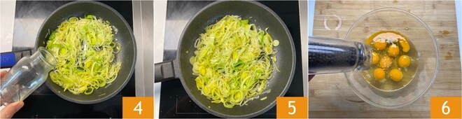 Faites revenir les poireaux pendant environ 6 minutes à feu moyen, en ajoutant un peu d'eau à mi-cuisson pour éviter qu'ils ne brûlent 4 ; ils doivent être dorés et bien ramollis 5. Pendant ce temps, dans un bol, versez les œufs et assaisonnez-les avec du sel et du poivre 6.