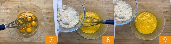 Battez avec un fouet 7, puis ajoutez le Parmigiano Reggiano AOP râpé 8 et le pecorino râpé 9.
