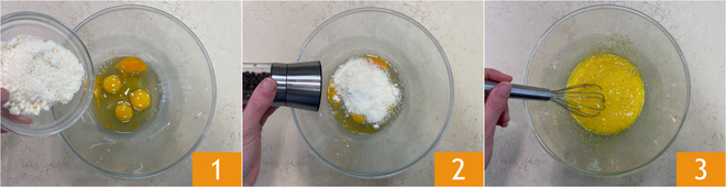 Pour préparer l'omelette jambon-fromage, commencez par casser les œufs dans un bol, ajoutez le parmesan 1, du sel, du poivre 2 et battez jusqu'à obtenir un mélange homogène 3.