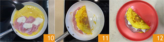 À ce stade, repliez la moitié vide sur la garniture 10 11. Votre omelette jambon-fromage est prête à être dégustée 12 !