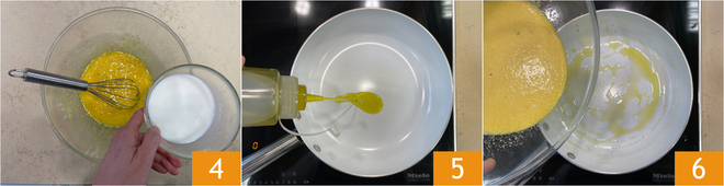 Ajoutez progressivement le lait 4 en continuant à mélanger, à la fin vous devez obtenir un mélange homogène assez liquide. Mettez un filet d'huile dans une poêle antiadhésive 5 puis versez le mélange 6 et faites cuire pendant environ 10 minutes à feu moyen.