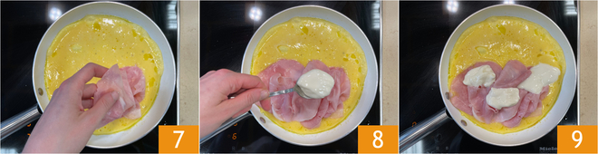 En fin de cuisson, ajoutez sur une moitié de l'omelette le jambon cuit 7 et le stracchino 8 9.