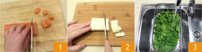 Pour réaliser l'omelette verte avec saumon, tome et sauce au safran, commencez par couper en dés le filet de saumon 1, faites de même avec la tome 2. Lavez les épinards sous l'eau courante 3 et égouttez-les,