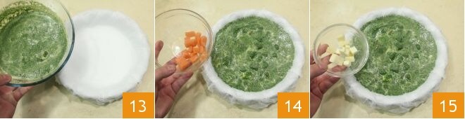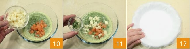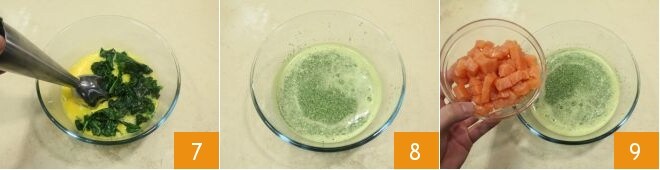 ajoutez les épinards cuits 7, mixez le mélange avec un mixeur plongeant pour obtenir un mélange homogène 8, incorporez les dés de saumon 9 en en réservant une cuillère à soupe,