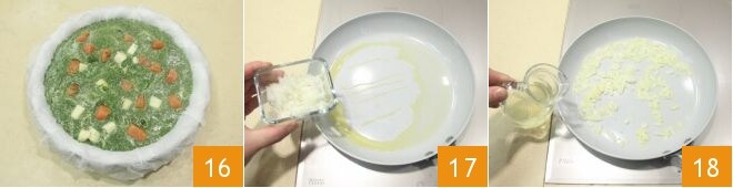 Une fois terminé 16, cuisez l'omelette au four statique à 180°C pendant 50 minutes (ou au four ventilé à 160°C pendant 40 minutes). Vérifiez la cuisson en piquant l'omelette avec un cure-dent, s'il reste sec, vous pouvez la sortir du four. Pendant que l'omelette cuit, préparez la sauce au safran : chauffez l'huile dans une poêle, ajoutez l'oignon haché 17, ajoutez le bouillon de légumes 18 et laissez mijoter pendant au moins 10 minutes,