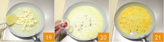 puis ajoutez la tome en morceaux 19 et poursuivez la cuisson pour la faire fondre. Une fois le fromage complètement fondu, ajoutez le poivre rose en grains, le safran en poudre 20 et mélangez avec une spatule pour l'incorporer à la sauce et obtenir une couleur homogène 21.