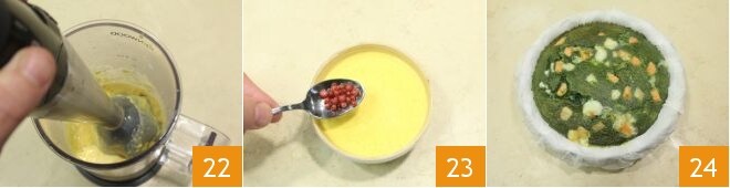 Transférez la sauce dans un verre haut et mixez-la avec un mixeur plongeant 22 pour la rendre lisse. Transférez la sauce dans un petit bol et ajoutez encore du poivre rose en grains à votre goût 23. Pendant ce temps, l'omelette sera cuite, sortez-la du four 24, laissez-la tiédir, puis servez-la avec la sauce.