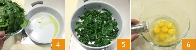 mettez-les dans une casserole avec un filet d'huile d'olive et une gousse d'ail 4 et faites-les flétrir à feu vif pendant 10-15 minutes jusqu'à ce qu'ils soient tendres, puis laissez-les refroidir 5. Dans un bol, battez les œufs avec une pincée de sel et de poivre 6