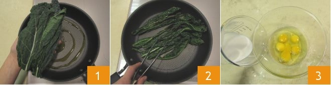 Pour préparer les petites omelettes avec du chou noir, commencez par retirer les tiges du chou noir et rincez les feuilles sous l'eau courante en les laissant entières. Chauffez un filet d'huile dans une poêle, ajoutez les feuilles de chou noir 1 et faites-les sauter environ 5 minutes à feu vif jusqu'à ce qu'elles soient ramollies 2. Réservez le chou noir et occupez-vous du mélange d'œufs : versez les œufs dans un bol et ajoutez le lait 3,