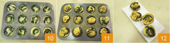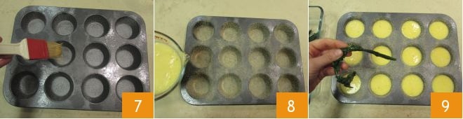 Beurrez un moule à muffins 7 et tapissez-le de chapelure, puis répartissez équitablement le mélange d'œufs à l'intérieur du moule 8 et déposez une feuille de chou dans chaque compartiment 9.