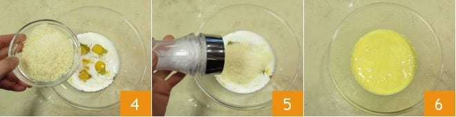 le Parmesan râpé 4, du sel 5 et du poivre, puis mélangez le tout avec un fouet ou une fourchette 6. Transférez le mélange dans une carafe pour remplir plus facilement les moules.