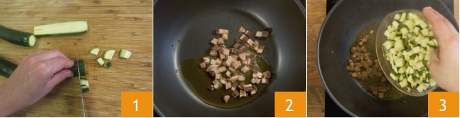 Pour préparer les orecchiette gratinées au four, commencez par faire bouillir une casserole d'eau pour les orecchiette. Nettoyez les courgettes et coupez-les en dés 1. Chauffez un filet d'huile dans une poêle et faites revenir les dés de lardons à feu vif 2, puis ajoutez les courgettes 3.