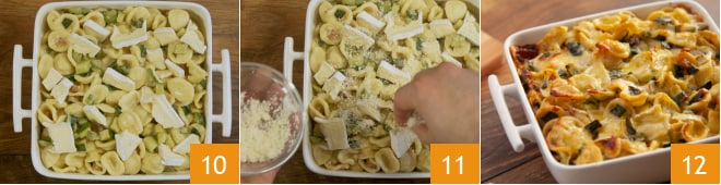 Ajoutez le brie en petits morceaux 10, saupoudrez de Parmigiano Reggiano râpé 11 et faites cuire dans un four statique préchauffé à 200° pendant environ 15 minutes jusqu'à ce que la surface soit bien dorée. Vos orecchiette gratinées au four sont prêtes à être sorties du four et servies 12 !