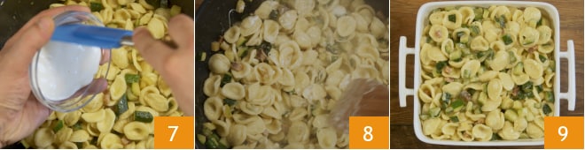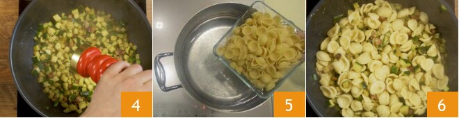 Assaisonnez avec du sel et du poivre 4 et laissez cuire à feu moyen pendant environ 10 minutes. Pendant ce temps, salez l'eau qui aura commencé à bouillir et faites cuire les orecchiette 5. Égouttez les pâtes al dente et versez-les directement dans la poêle avec les courgettes et les lardons 6. Mélangez brièvement et retirez du feu.
