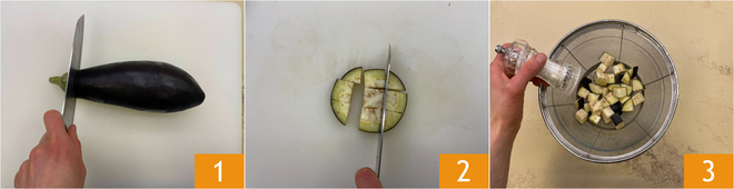Pour préparer les paccheri à la crème d'aubergines frites, lavez et équeutez l'aubergine 1, puis coupez-la en tranches d'environ 1 cm d'épaisseur et réduisez-les en dés 2. Placez les dés dans une passoire et salez légèrement 3. Laissez dégorger environ 30 minutes, elles seront ainsi plus sèches et n'absorberont pas trop d'huile pendant la friture.