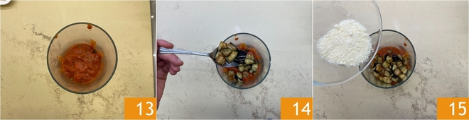 Versez-la dans un bol 13, ajoutez deux cuillères à soupe d'aubergines 14 et le Grana Padano DOP râpé 15.