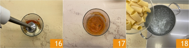 Mixez le tout avec un mixeur plongeant 16, jusqu'à obtenir une crème homogène 17. Faites cuire les paccheri dans une grande quantité d'eau salée 18.