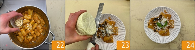 Ajoutez les pignons 22 et mélangez. Servez dans les assiettes avec une pincée de ricotta salata râpée 23 et quelques feuilles de basilic frais. Les paccheri à la crème d'aubergines frites sont prêts à être servis 24 !