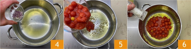 Pendant ce temps, préparez la sauce : dans une casserole, chauffez un filet d'huile avec l'échalote hachée 4. Faites fondre l'échalote, puis versez les tomates pelées 5 et salez 6.