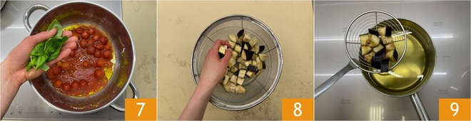 Assaisonnez de poivre et de basilic frais 7 et faites cuire pendant 5 minutes ; mettez la sauce de côté. Récupérez les aubergines, pressez-les légèrement avec les mains 8. Dans une casserole, chauffez l'huile végétale à environ 170 °C, puis plongez-y les aubergines 9.