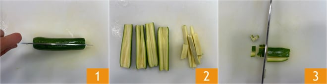 Pour préparer les paccheri à la crème, saucisse et courgettes, commencez par couper les extrémités des courgettes, puis divisez-les en deux 1, retirez la partie de la pulpe avec les graines 2 et ensuite coupez-les en dés 3. Mettez-les de côté dans un bol.