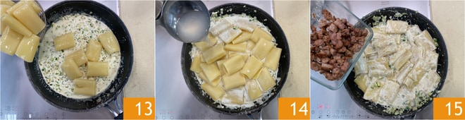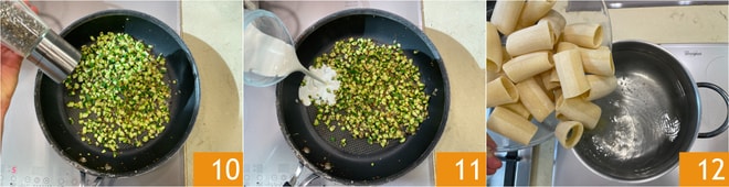 Salez, poivrez 10 et faites cuire pendant 3 minutes. Ajoutez la crème 11 et faites cuire encore 2-3 minutes. En attendant, faites cuire les paccheri al dente 12.