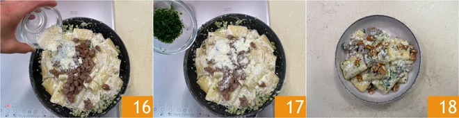 Ajoutez le Parmigiano Reggiano 16 et le persil haché 17, mélangez et servez vos paccheri à la crème, saucisse et courgettes 18 avec des noix concassées.