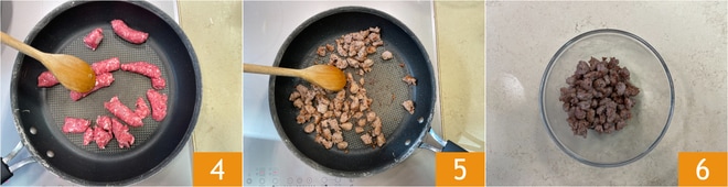 Dans une poêle, versez la saucisse, sans la peau 4, émiettez-la en appuyant avec une cuillère en bois et faites-la revenir pendant quelques minutes jusqu'à ce qu'elle soit bien dorée 5. Versez-la dans un bol et mettez-la de côté 6.