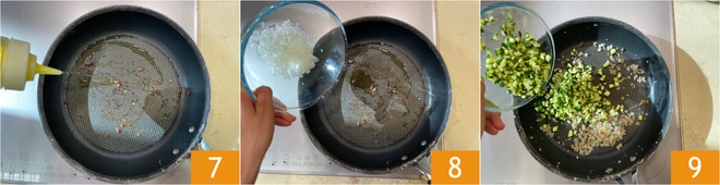 Dans la même poêle, ajoutez un filet d'huile 7, l'oignon haché 8 et faites-le revenir à feu modéré pendant quelques minutes, puis ajoutez les courgettes 9.
