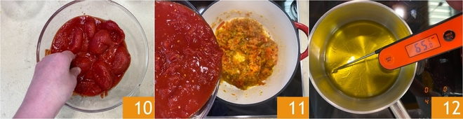 Écrasez les tomates pelées 10 et versez-les dans le sofrito 11, mélangez et faites cuire à feu doux pendant environ 50 minutes, jusqu'à ce que la sauce soit réduite et consistante. Pendant ce temps, préparez l'huile au basilic: chauffez l'huile à environ 65°C pendant 5 minutes, en contrôlant la température avec un thermomètre alimentaire approprié 12.