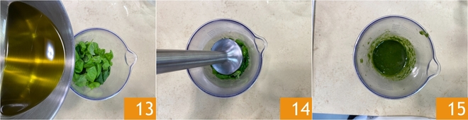 Versez l'huile chaude sur les feuilles de basilic frais rassemblées dans le verre du mixeur 13, puis mixez avec le mixeur plongeant 14 jusqu'à obtenir une huile verte et parfumée 15.