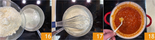 Passez maintenant à la fondue de Parmesan: chauffez la crème dans une petite casserole sans la porter à ébullition et incorporez progressivement le Parmesan Reggiano râpé 16, en mélangeant avec un fouet 17 jusqu'à obtenir une crème lisse et veloutée. Gardez-la au chaud. Lorsque la sauce est prête, retirez la gousse d'ail 18.