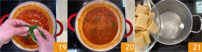 Parfumez avec du basilic frais déchiré directement avec les mains 19; mélangez et laissez imprégner encore un instant 20. Portez à ébullition une grande quantité d'eau salée et faites cuire les paccheri 21 jusqu'à ce qu'ils soient al dente.
