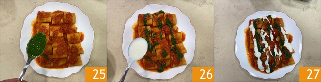Dressez en disposant les paccheri dans l'assiette, complétez avec quelques cuillerées d'huile au basilic 25 et enfin garnissez avec la fondue de Parmesan 26. Servez immédiatement les paccheri à la sauce simulée bien chauds 27!