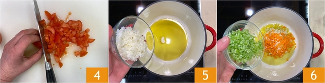 Ensuite, coupez les tomates fraîches en morceaux 4. Dans une grande casserole, chauffez l'huile d'olive extra vierge et ajoutez une gousse d'ail écrasée, puis ajoutez l'oignon haché 5, la carotte et le céleri 6 et faites cuire à feu doux jusqu'à ce que les légumes soient tendres et brillants.