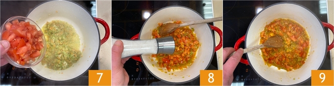 Ajoutez les tomates fraîches en morceaux 7 et laissez-les flétrir, puis assaisonnez de sel 8 et de poivre. Mélangez bien, en laissant tout s'imprégner jusqu'à ce que le fond soit bien amalgamé 9.