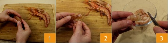 Pour préparer les schiaffoni (paccheri) aux fruits de mer, commencez par nettoyer le poisson, en commençant par les Comment nettoyer les crevettes: enlevez la tête 1 et la queue, puis avec les doigts, retirez la carapace 2; incisez le dos et extrayez l'intestin interne (le filament noir) en le tirant délicatement avec des pinces de cuisine 3 (vous pouvez aussi utiliser un cure-dent).