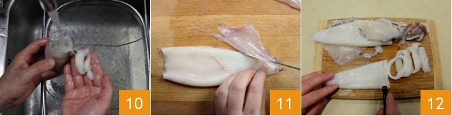 rincez-les sous l'eau courante 10 et enlevez la peau et les nageoires 11. Coupez les calamars en anneaux 12 et mettez-les de côté.