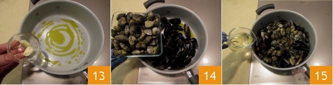 Faites revenir 2 gousses d'ail avec un filet d'huile dans une poêle antiadhésive 13. Quand l'ail est bien doré, retirez-le, puis ajoutez les moules et les palourdes 14, en ajoutant 50 g de vin blanc 15 et en assaisonnant de sel et de poivre à votre goût.