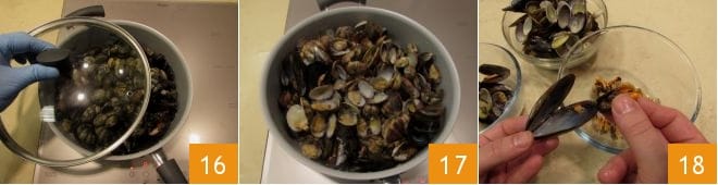 Faites cuire à feu vif en couvrant avec un couvercle 16, en laissant les mollusques s'ouvrir spontanément 17 : cela prendra environ 5 minutes. Après ce temps, vérifiez toutes les moules et les palourdes : celles qui ne se sont pas ouvertes doivent être jetées. Éteignez le feu et égouttez-les en conservant le liquide de cuisson, puis séparez les valves vides des moules 18 et des palourdes de celles pleines, en en conservant quelques-unes entières pour la présentation finale du plat.
