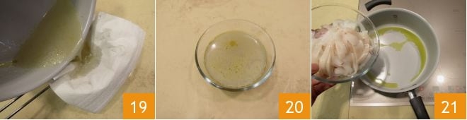 Dans un bol, filtrez le fond de cuisson des mollusques, en plaçant du papier absorbant sur un tamis fin 19, puis mettez de côté le liquide que vous avez obtenu 20. Dans une poêle antiadhésive, faites chauffer l'huile avec une gousse d'ail, puis ajoutez les calamars coupés en anneaux 21 ;