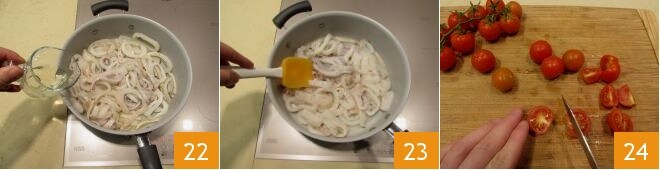 déglacez avec le vin blanc restant 22 et faites cuire pendant 4 minutes, en mélangeant le tout avec une spatule 23. Coupez les tomates cerises en deux 24 et