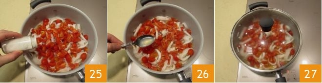 ajoutez-les aux calamars, en assaisonnant de sel 25 et de poivre et en ajoutant de temps en temps 50 g de liquide de cuisson des mollusques que vous avez filtré précédemment 26. Continuez la cuisson pendant 4 minutes supplémentaires à feu doux en couvrant avec un couvercle, jusqu'à ce que les calamars soient bien tendres 27.