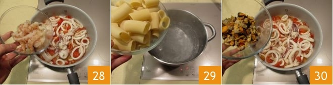 Ensuite, ajoutez également les crevettes 28. Mettez une casserole sur le feu avec suffisamment d'eau salée qui vous servira pour les pâtes; quand l'eau aura frôlé l'ébullition, faites cuire les schiaffoni (ou paccheri) pendant 15 minutes 29. Ajoutez aux mollusques les moules et les palourdes et faites cuire pendant 4 minutes supplémentaires 30