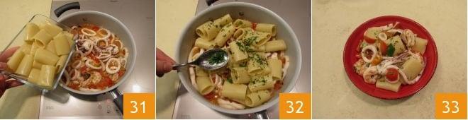 Lorsque les pâtes sont prêtes, égouttez-les et ajoutez-les à la sauce à base de poisson et de tomates cerises que vous avez préparée 31. Faites sauter le tout pendant 3 minutes, en ajoutant encore 50 g de liquide de cuisson pour que les pâtes s'imprègnent de saveur, enfin saupoudrez de persil haché 32; éteignez le feu. Vos schiaffoni (ou paccheri) aux fruits de mer sont prêts à être servis 33. Si vous le souhaitez, vous pouvez décorer le plat avec les mollusques entiers (palourdes et moules) que vous avez mis de côté.