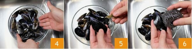 Mettez de côté les crevettes et passez aux Comment nettoyer et ouvrir les moules et aux palourdes. Rincez les moules sous l'eau courante 4; avec le dos d'une lame de couteau, éliminez toutes les incrustations et les cirripèdes (parasites qui se forment sur la coquille) et, avec un mouvement énergique, détachez manuellement la barbe (ou byssus) qui dépasse des valves 5 (pour faciliter l'opération, vous pouvez saisir le byssus avec un torchon). Toujours sous l'eau courante froide et en utilisant une paille de fer (ou une brosse rigide), frottez énergiquement les moules pour éliminer toutes les impuretés 6. Une fois nettoyées, mettez-les de côté.