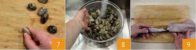 Vérifiez que les palourdes ne contiennent pas de sable : tapotez-les une à une sur une planche à découper du côté de l'ouverture 7 : si du sable sombre sort, cela signifie que la palourde est pleine de sable et doit être jetée. Éliminez également celles qui ont la coquille cassée. Ensuite, placez les palourdes dans une passoire posée sur un bol et rincez-les plusieurs fois sous l'eau courante 8 : arrêtez lorsque vous ne verrez plus de sable dans le bol. Prenez les Comment nettoyer les calamars, détachez la tête et enlevez le cartilage interne 9 ;